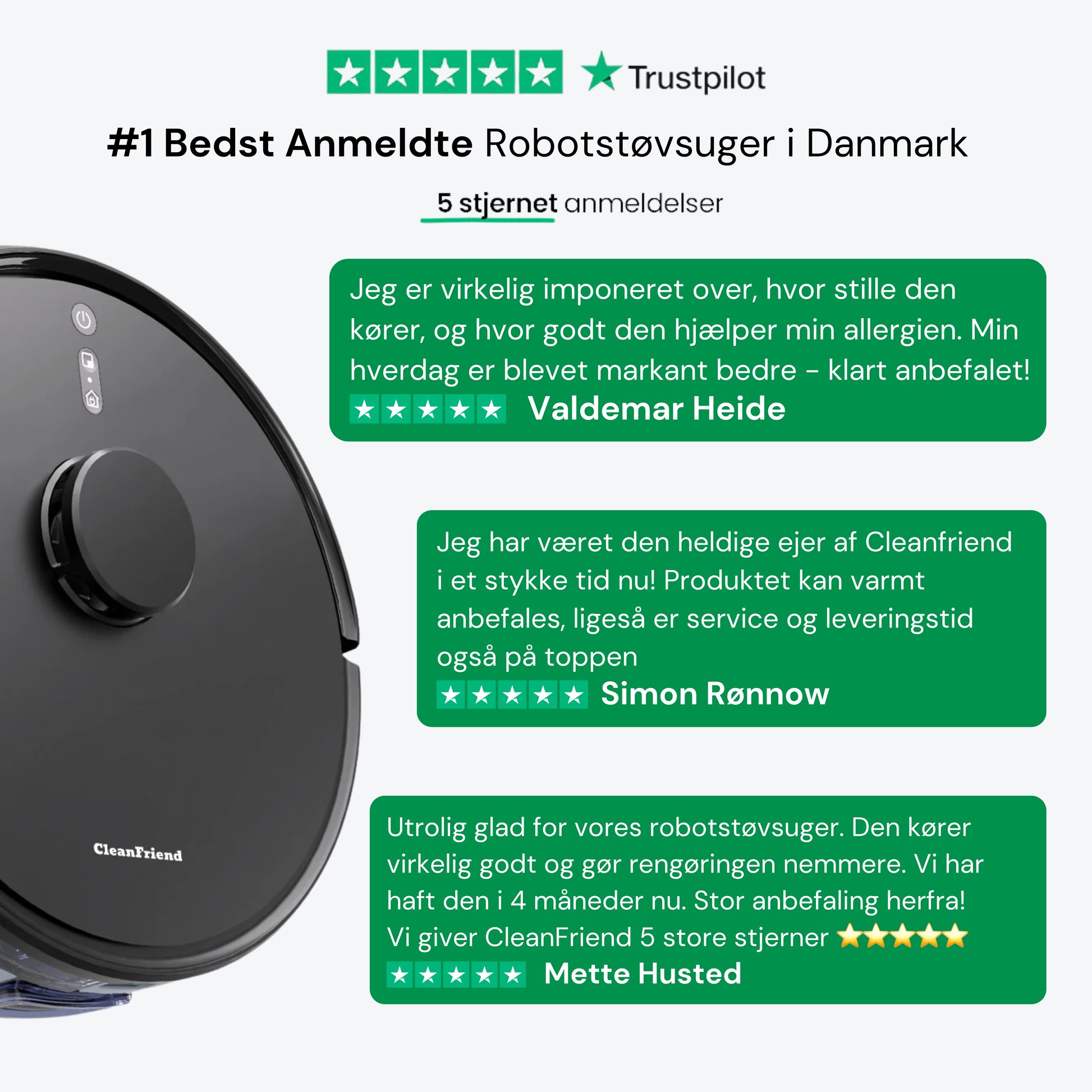 Alt spillede – fra bestilling til levering og opsætning. CleanFriend 360 Max lever fuldt ud op til navnet. Rengøring er blevet noget jeg slet ikke tænker på længere, og det er en kæmpe lettelse i en travl hverdag. Alt spillede – fra bestilling til levering og opsætning. CleanFriend 360 Max lever fuldt ud op til navnet.... Alt spillede – fra bestilling til levering og opsætning. CleanFriend 360 Max lever fuldt ud op til navnet. Rengøring er blevet noget jeg slet ikke tænker på længere, og det er en kæmpe lettelse i en travl hverdag.