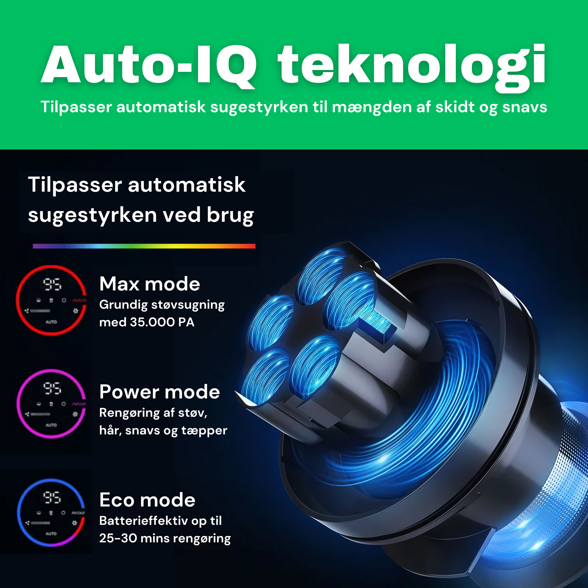 Auto-IQ teknologi: tilpasser automatisk sugestyrken Auto-IQ teknologi: tilpasser automatisk sugestyrken